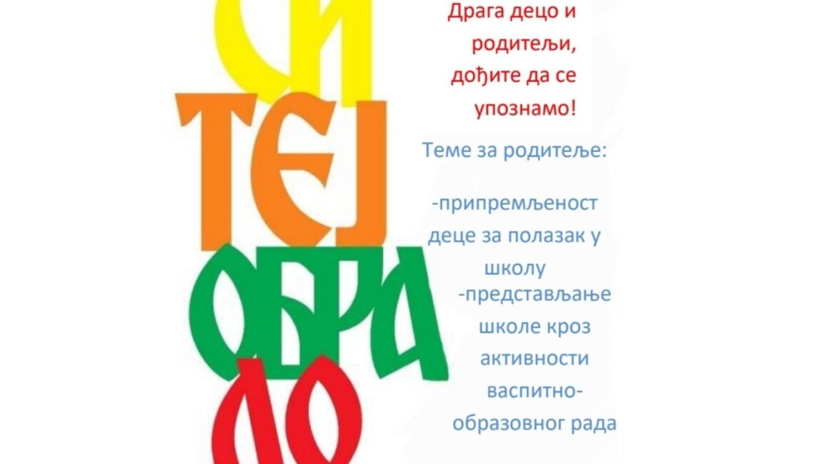 Драги предшколци и родитељи предшколца дођите да се упознамо 21. 12. 2023. године. Позивамо будуће прваке из вртића Бамби и Пчелица у 16 и 30 часова, а предшколце из вртића: Невен, Даница, Душко Радовић, Полетарац, Саволино, Blue Bunny и осталих приватних вртића у 18 часова. Видимо се!